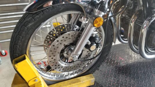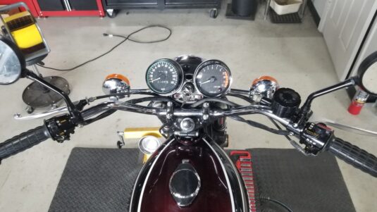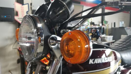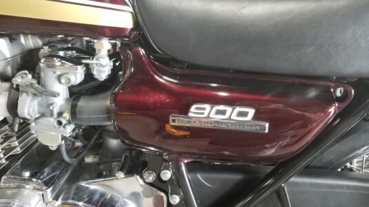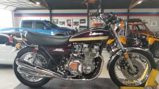 1975 Kawasaki 900 Z1-B. Nicely restored. Reproduction pipes, but otherwise appears built with original parts. Optional dual disc front brakes. Beautiful paint, title in hand.
